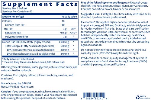 Klaire Labs – Aceite de pescado Eicosamax TG – Aceite de pescado ultra puro EPA DHA (60 geles suaves)