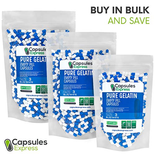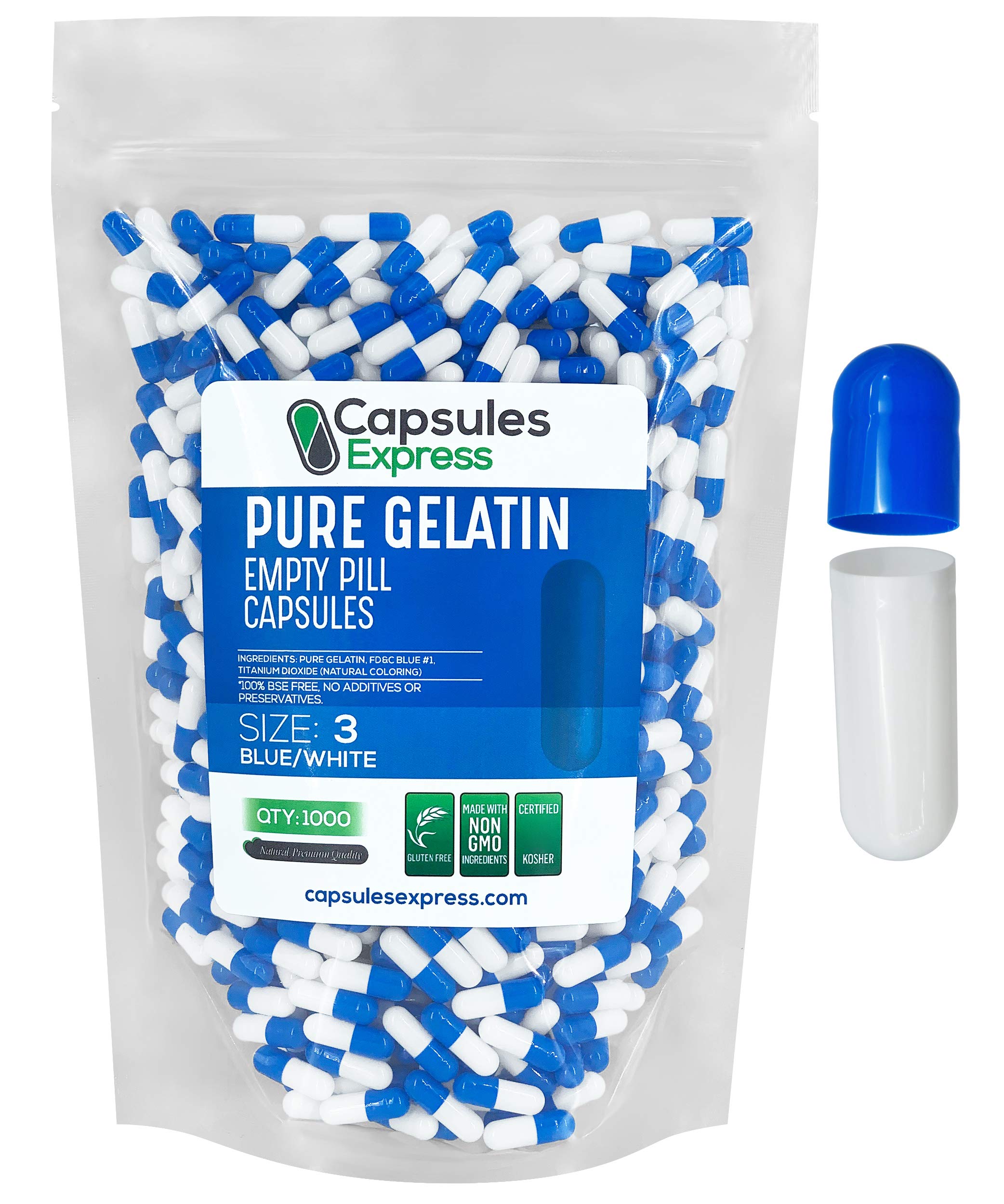 Càpsulas Express, tamaÐo 3, càpsulas vacÕas de gelatina azul y blanca, Kosher, càpsula de pastilla de gelatina pura, relleno de polvo DIY, 1000
