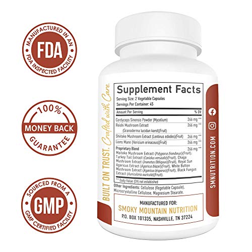 10 Mushroom Blend Supplement - 90 Capsules; 10 Mushroom Extract Immune Support; Organic Lions Mane Turkey Tail Cordyceps Reishi Shiitake Maitake Chaga Mushroom Immunity Complex