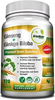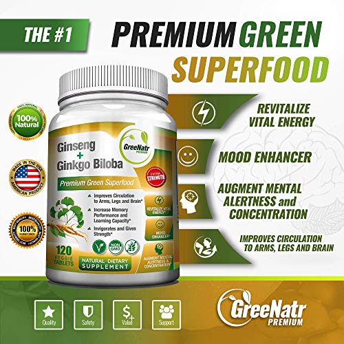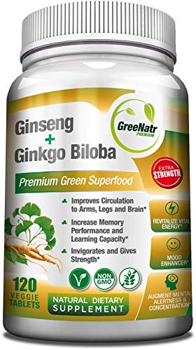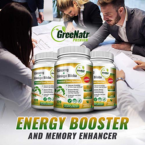 Ginseng + Ginkgo Biloba Tablets - Premium Non-GMO/Veggie Superfood - Traditional Energy Booster and Brain Sharpener 120 Tablets